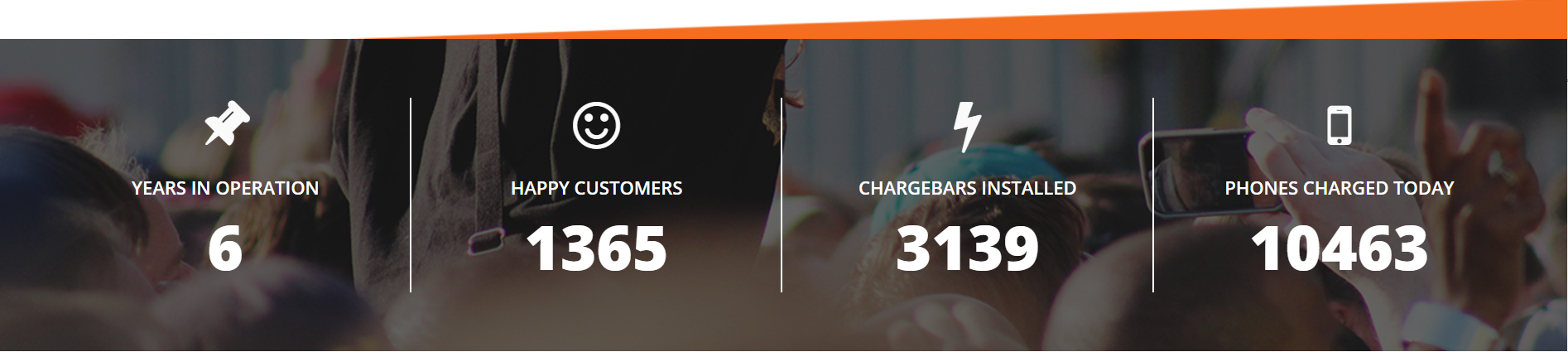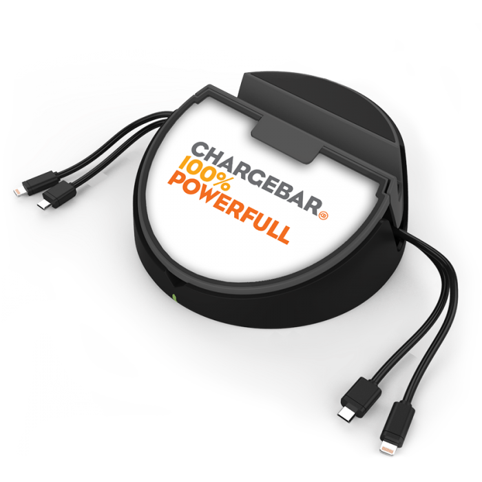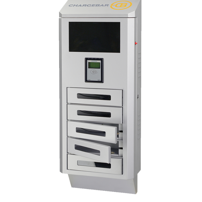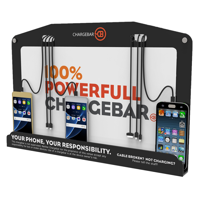 A ‘Chargebar’ is a place where people can recharge their mobile phone or tablet. They are permanently installed in out-of-home locations or hired for events such as festivals and conferences. Each Chargebar has 4 to 16 cables catering for virtually all devices on the market and supplies the fastest possible recharge speed allowed by the device manufacturer.